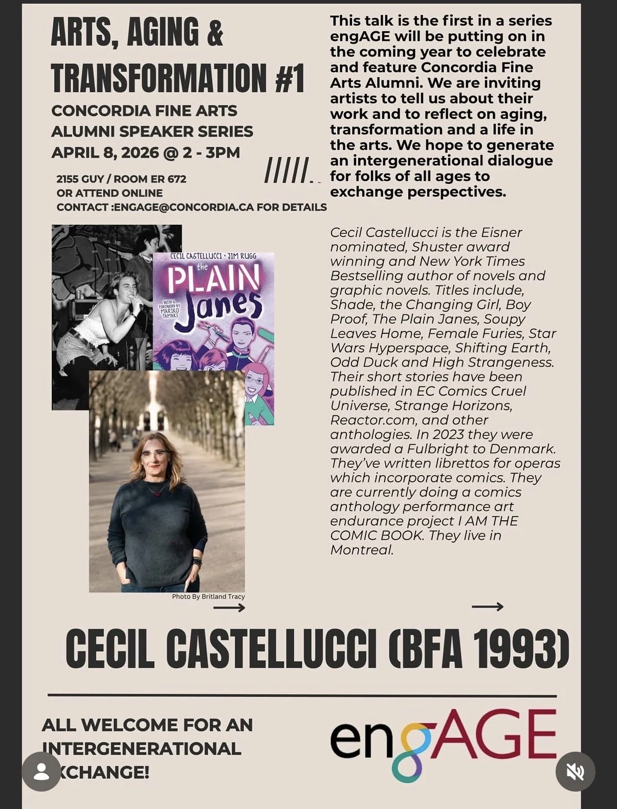 Come join me for a talk about Arts, Aging and Transformation on April 8th at 2 PM at Concordia University Center for Aging and Fine Arts. https://www.concordia.ca/cuevents/offices/vprgs/engage/2026/04/08/cecil-castellucci-arts-aging-and-transformation-concordia-fine-arts-alumni-speaker-series.html